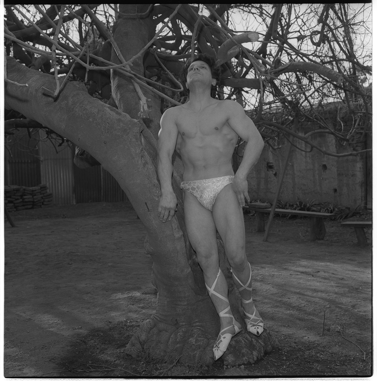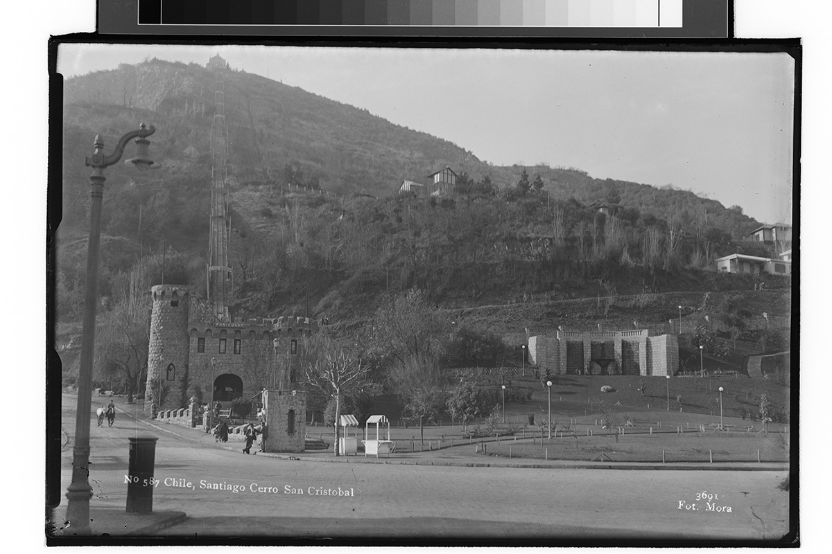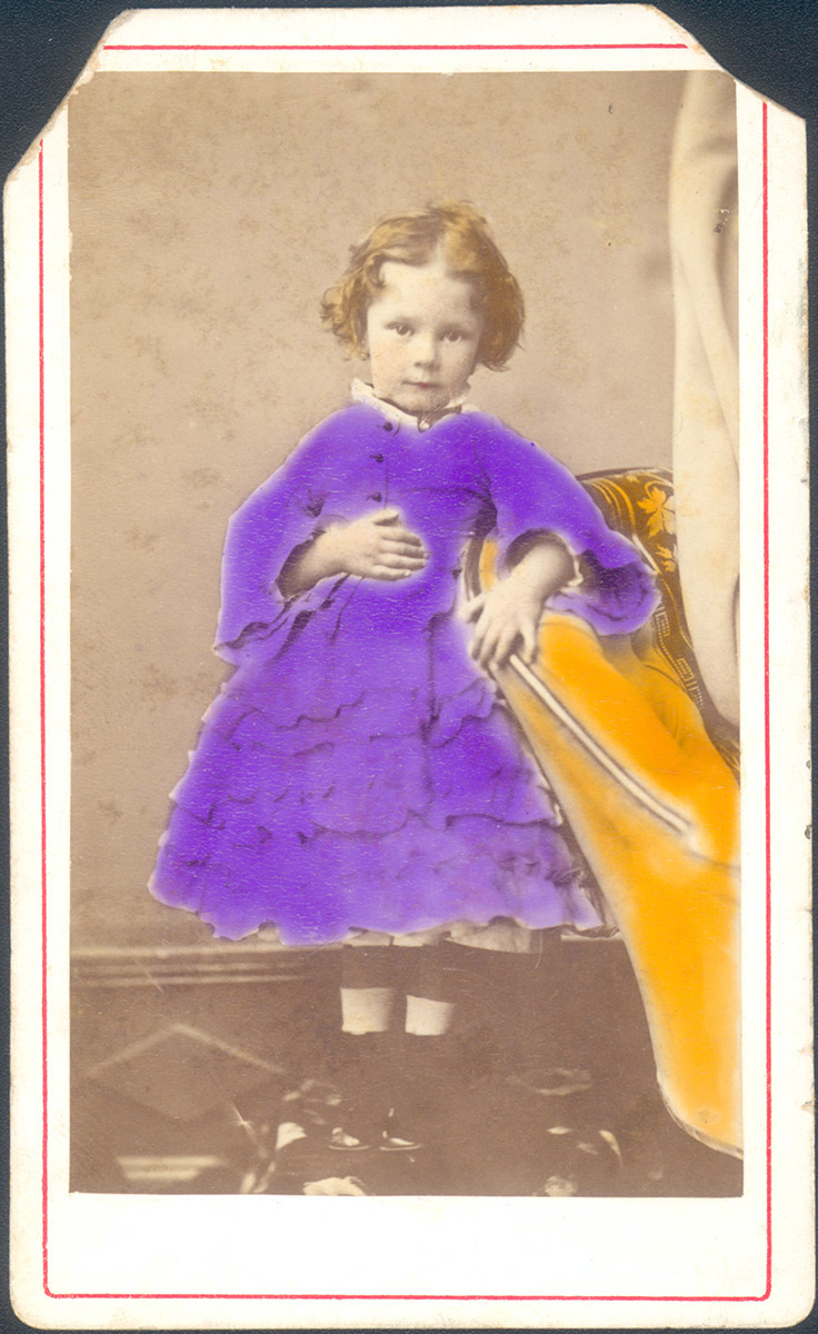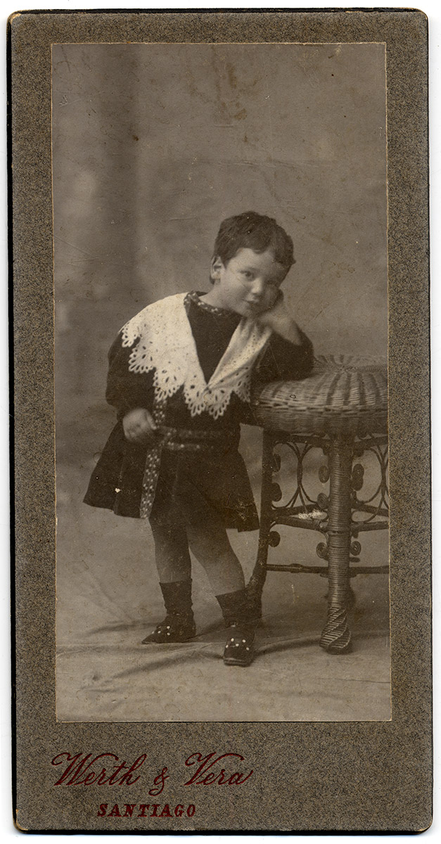 Retrato de una mujer con vestido y sombrero que lleva en sus brazos un bebé llorando.