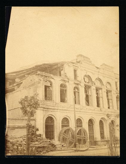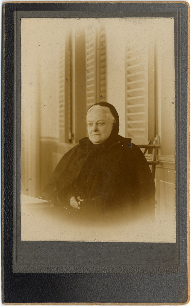 Retrato de mujer en estudio. Su figura se presenta parada sujetándose de un especie de tronco con un vestido largo y decorado. En la parte trasera se ve el telón decorativo del estudio.