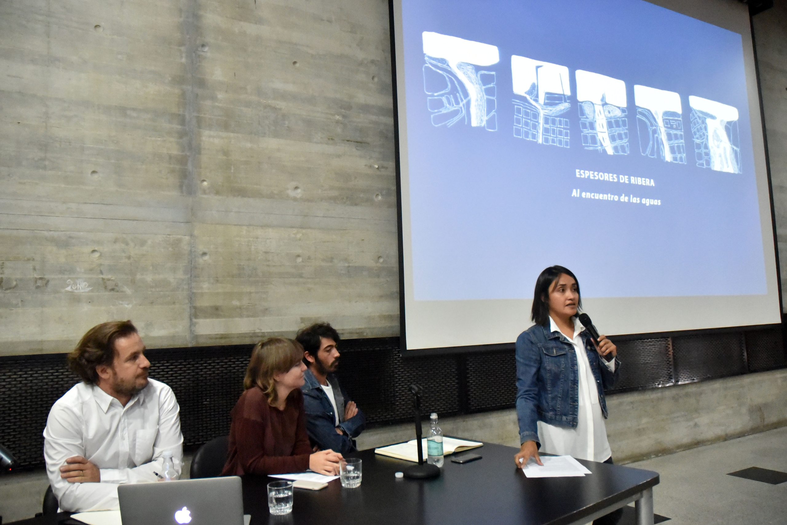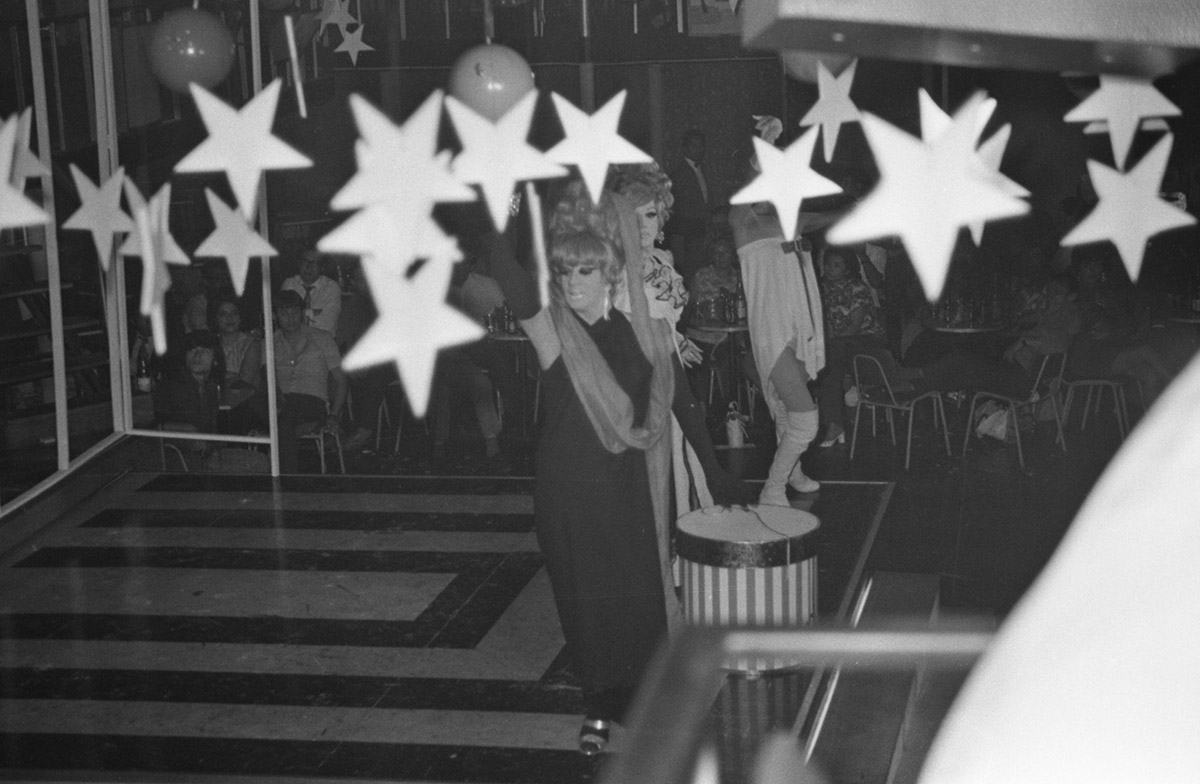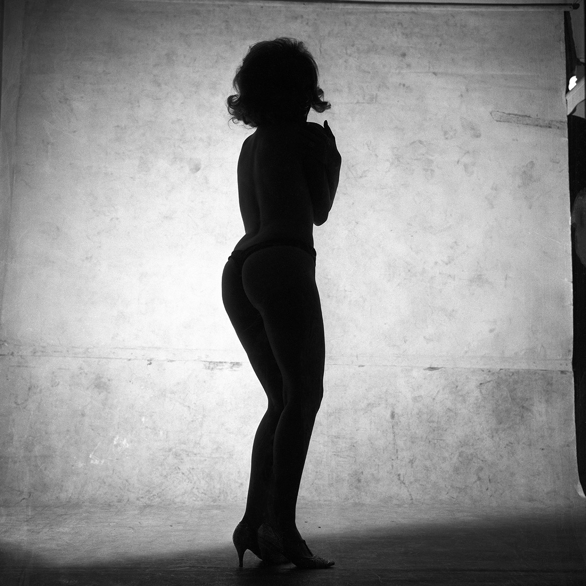 Mujer de espalda con su cabeza de perfil se mira en un espejo redondo. Tiene el pelo tomado, aro y un lunar arriba de la boca. Tiene los hombros descubiertos.