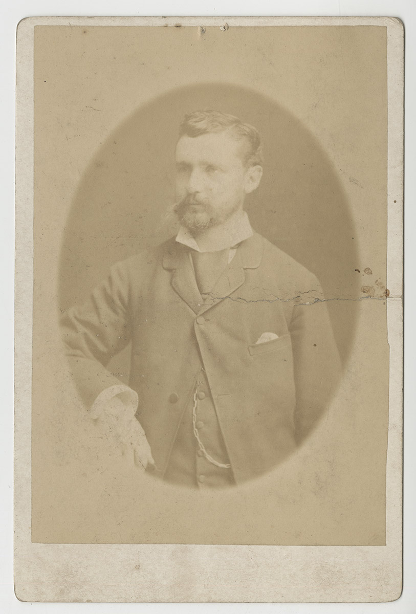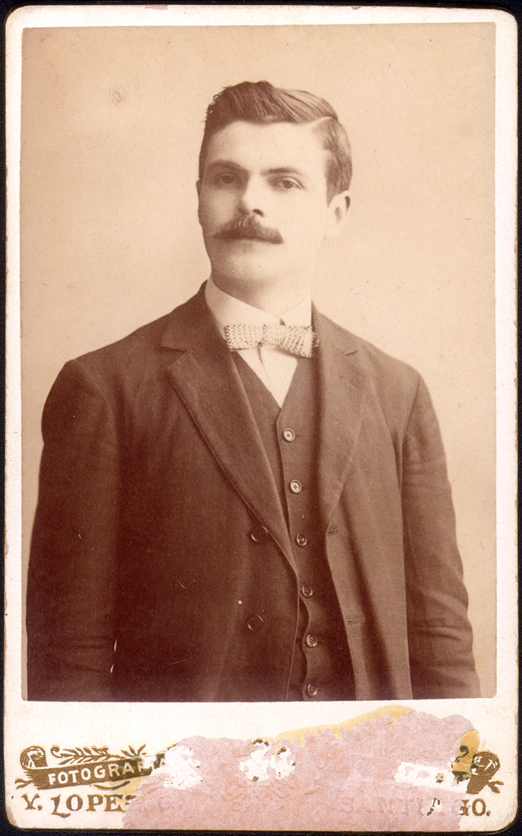 Retrato de una niña con vestido blanco corto y capa negra está sentada sobre una silla en el patio de una casa. Lleva sentada sobre sus rodillas a una muñeca con vestido blanco y negro.