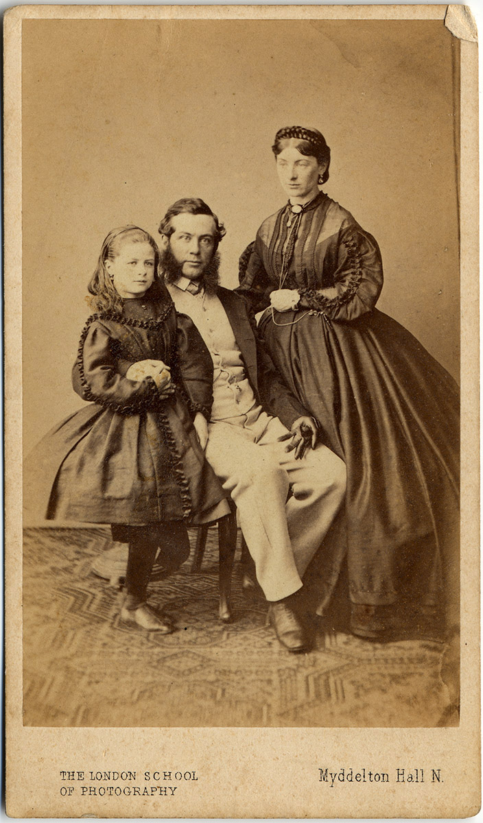 Grupo compuesto de seis mujeres, dos hombres y un niño están sentados alrededor de una mesa larga de madera bajo una carpa. El niño mira fijamente la cámara.