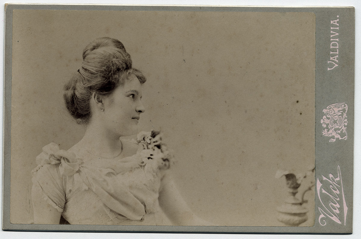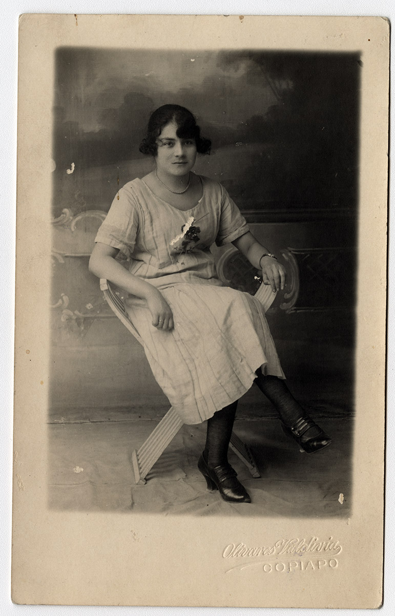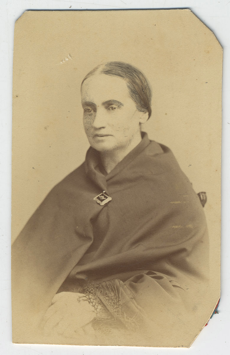 Religiosa, de hábito negro con un velo negro, alrededor de su cabeza se encuentra una tela blanca, sus manos sostienen un libro y sobre su pecho se encuentra una cruz.