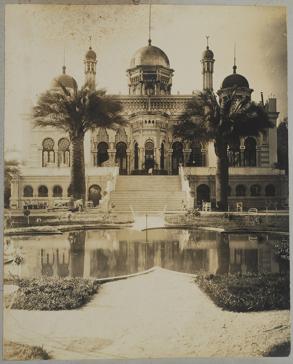 Fotografía que detalla el diseño de la reja metálica que rodea un conjunto de edificios y jardines.