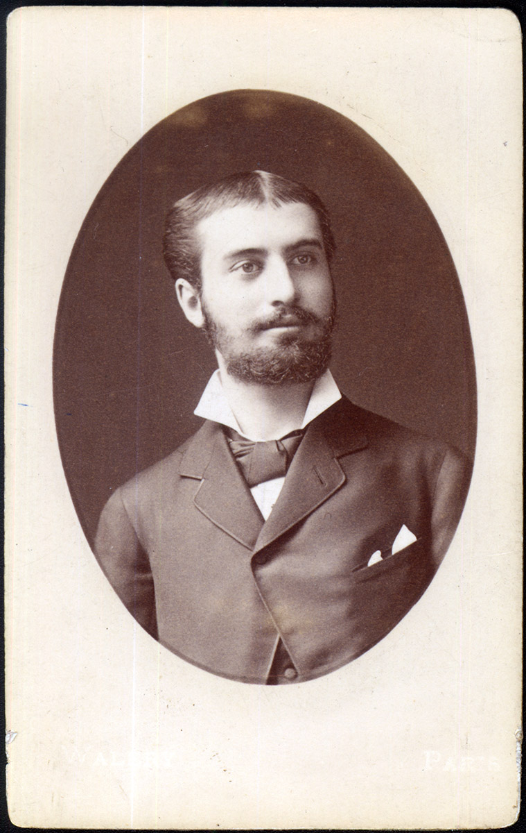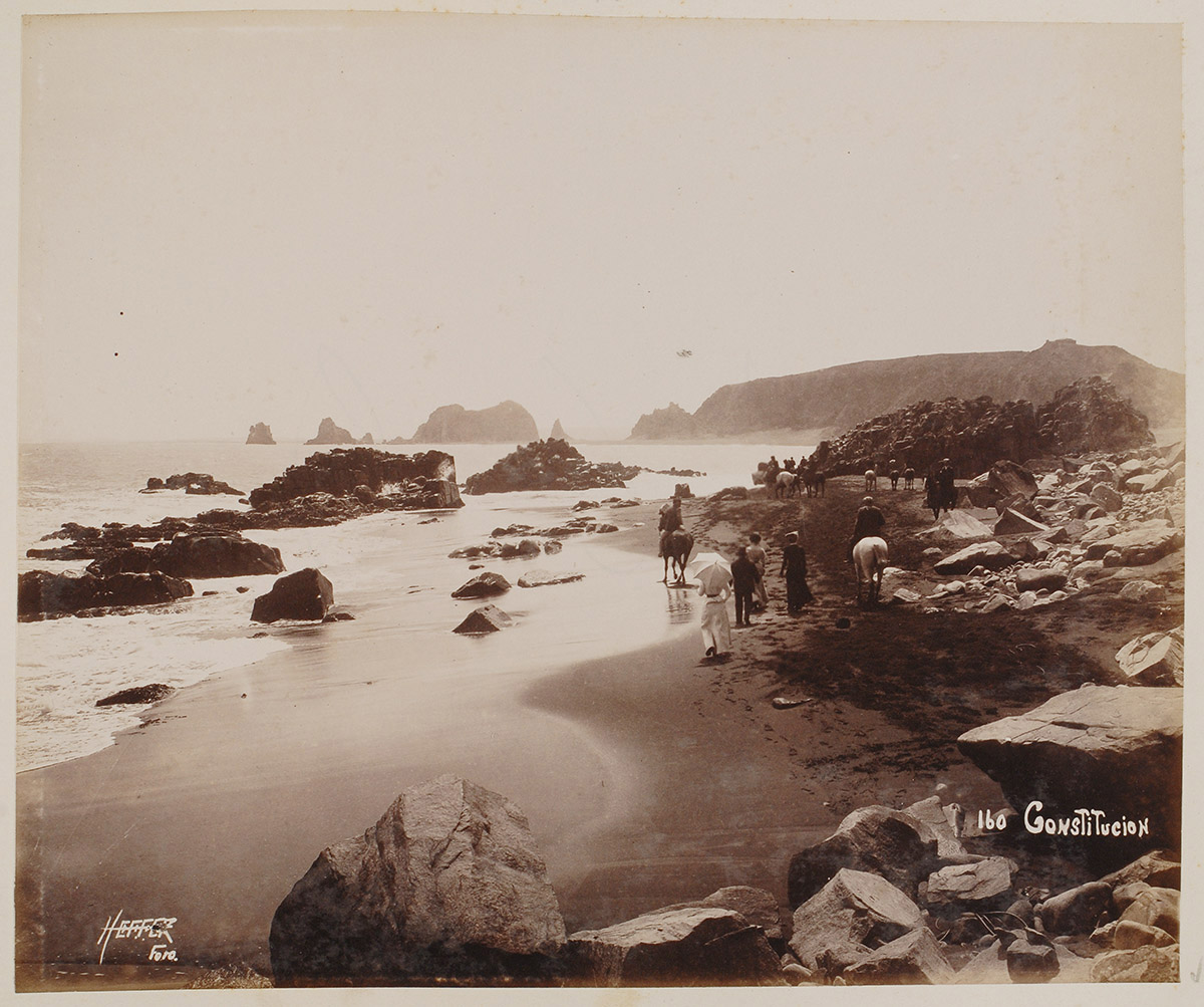 Un niño está de pie ubicado en el centro de la fotografía, su mano derecha está apoyada en un sitial. Su vestimenta corresponde a un pequeño chaleco con botones, una blusa y una falda larga, en sus pies tiene unos botines.