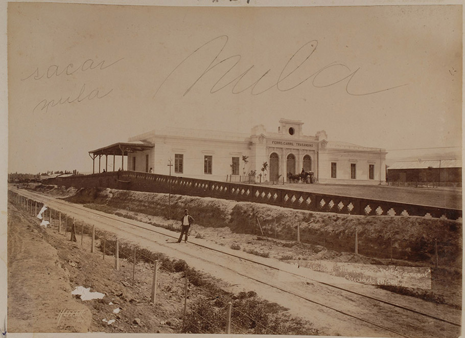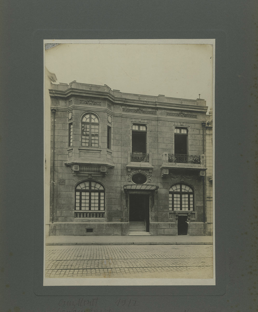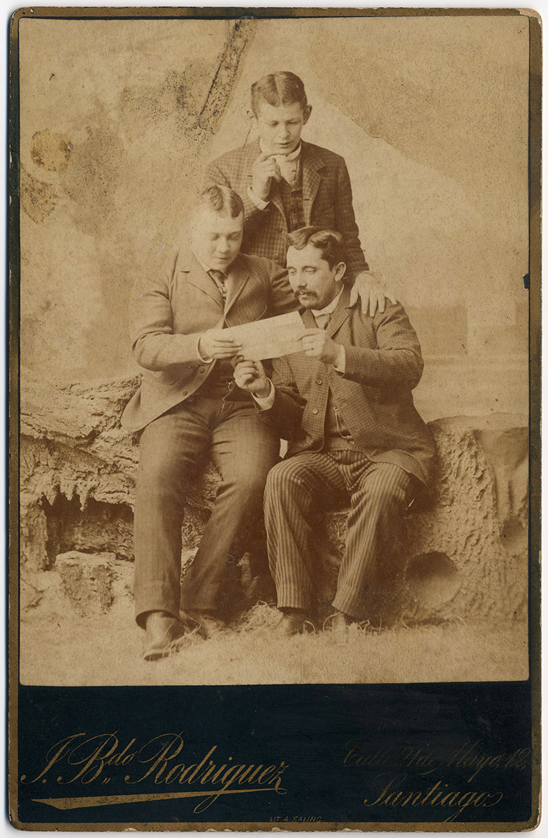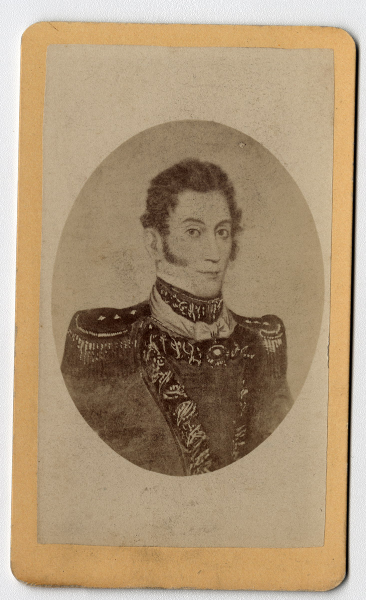 Retrato de un hombre con barba y bigote. Viste un terno negro con abrigo negro cerrado y un sombrero en la mano.