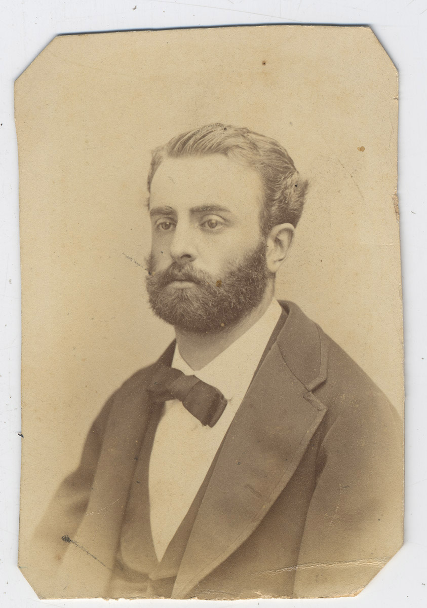 Retrato de una mujer con vestido amplio blanco con motivos florales y chal negro de pie al lado de un niño con uniforme blanco con cuadros negros.