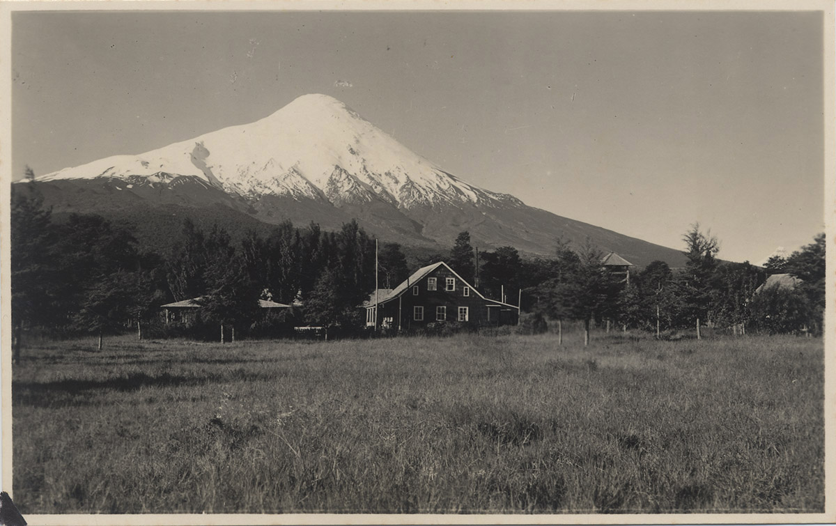 Retrato de una mujer con vestido negro y peinado muy tirado sobre una escalera.
