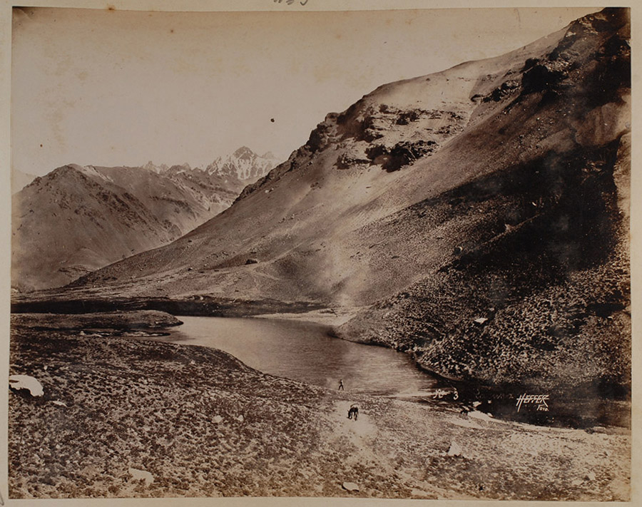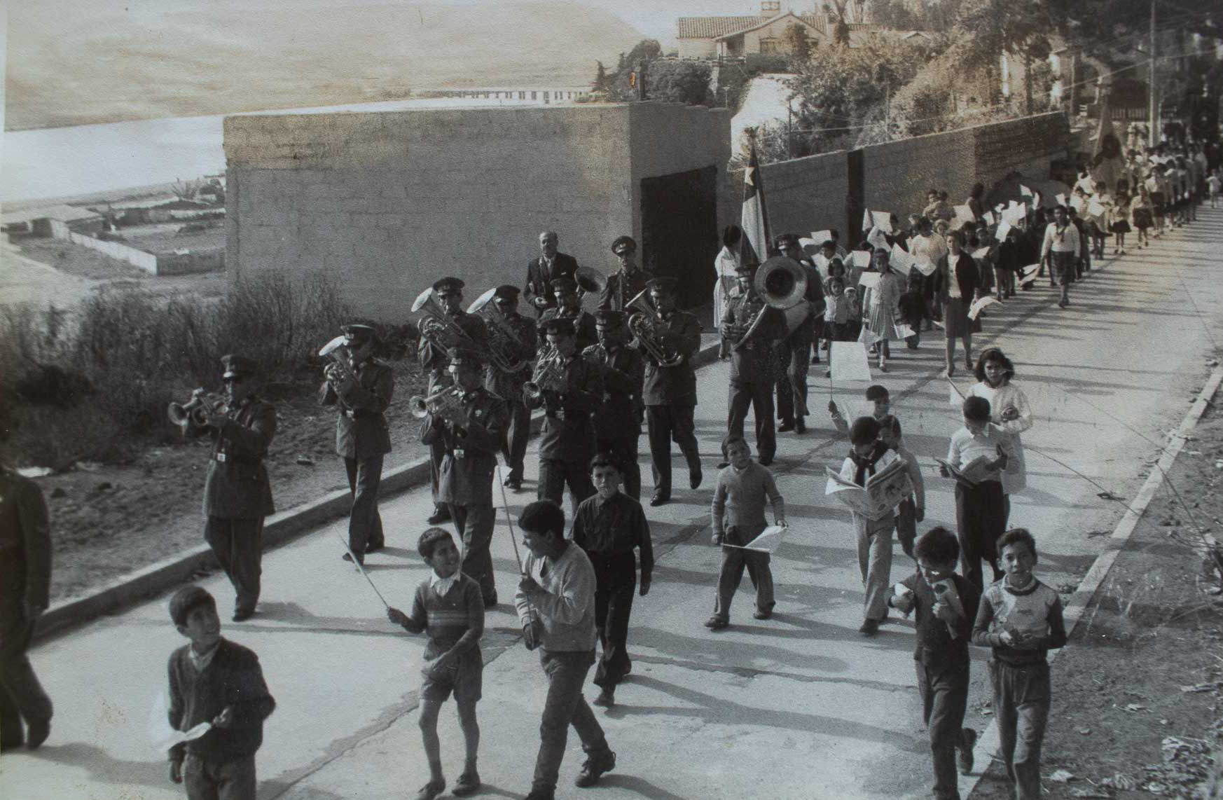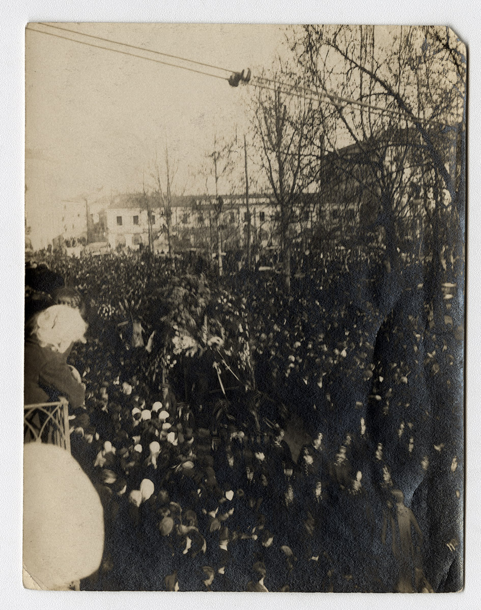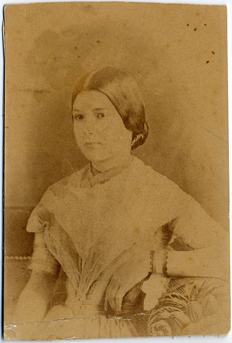 Retrato de pie de una mujer con pelo recogido con flores y vestido negro. Se encuentra parada al lado de un pilar sobre el cual apoya sus manos.