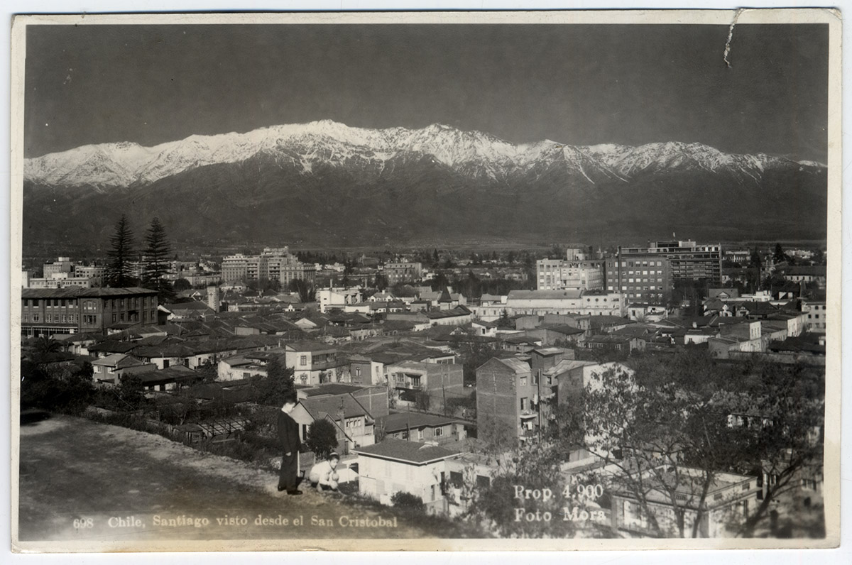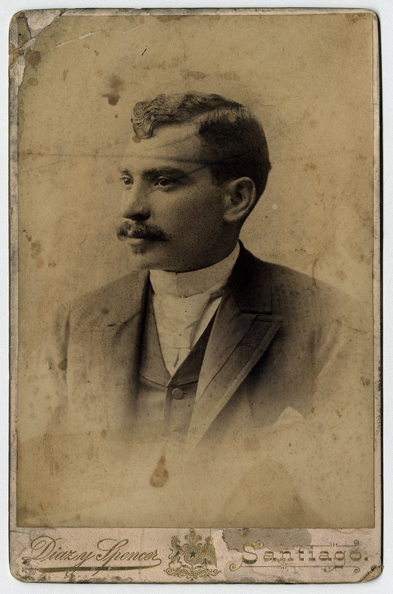 Retrato de un eclesiástico sentado. Lleva el traje negro con cuello blanco tradicional y una capa negra. El telón de fondo representa una iglesia con cúpula.