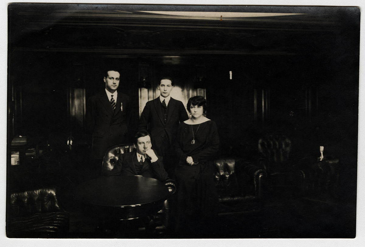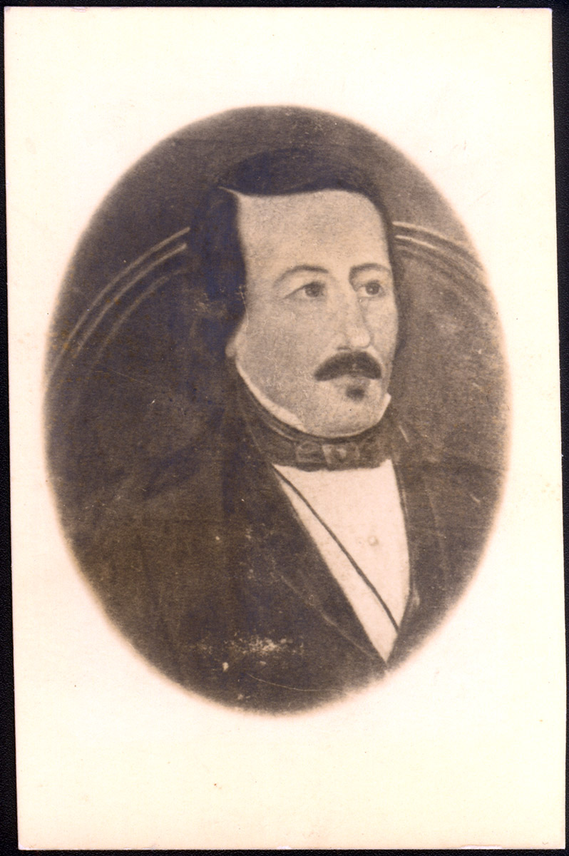 Retrato de busto de un hombre con barba y bigote. Viste un abrigo cerrado dentro del cual esconde los dedos de su manos.