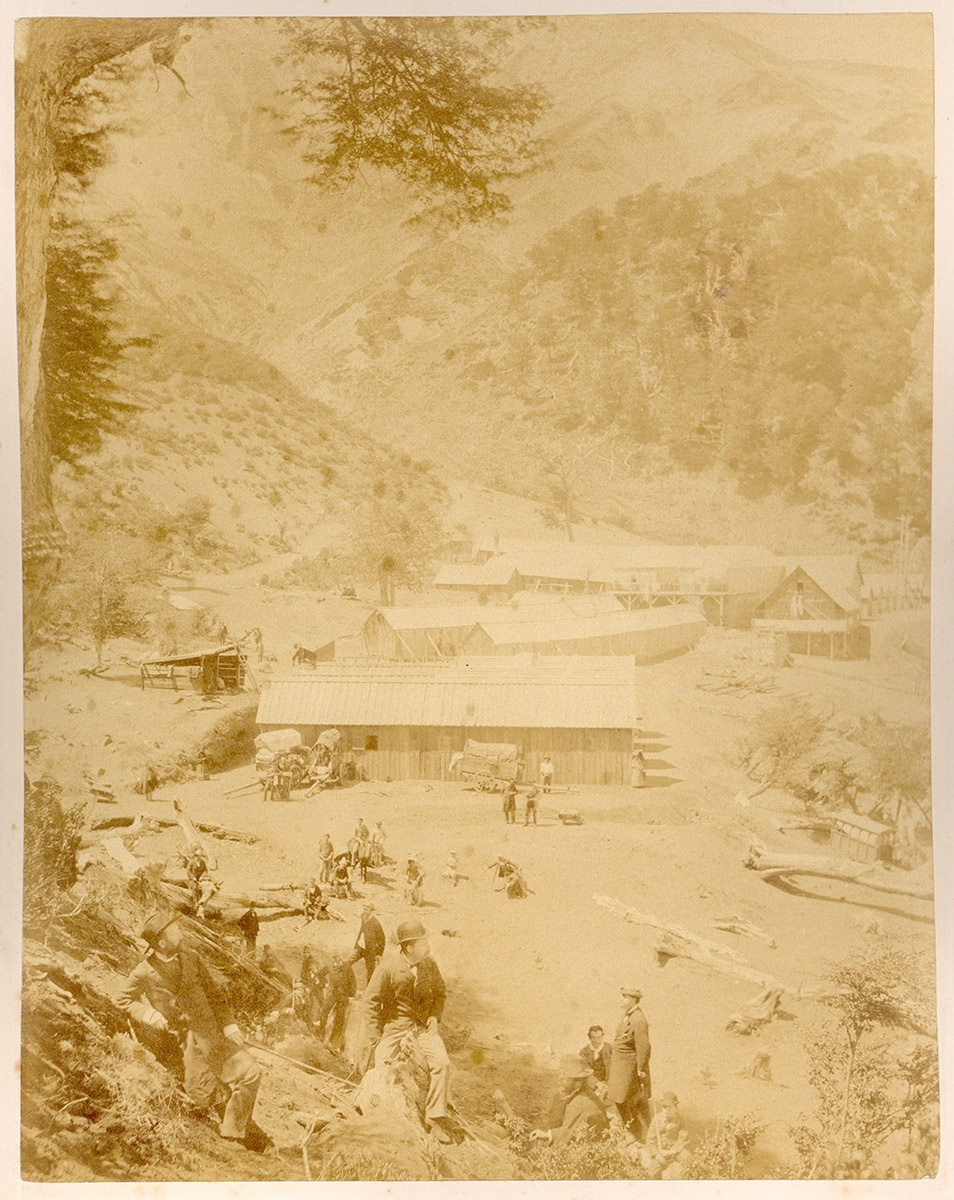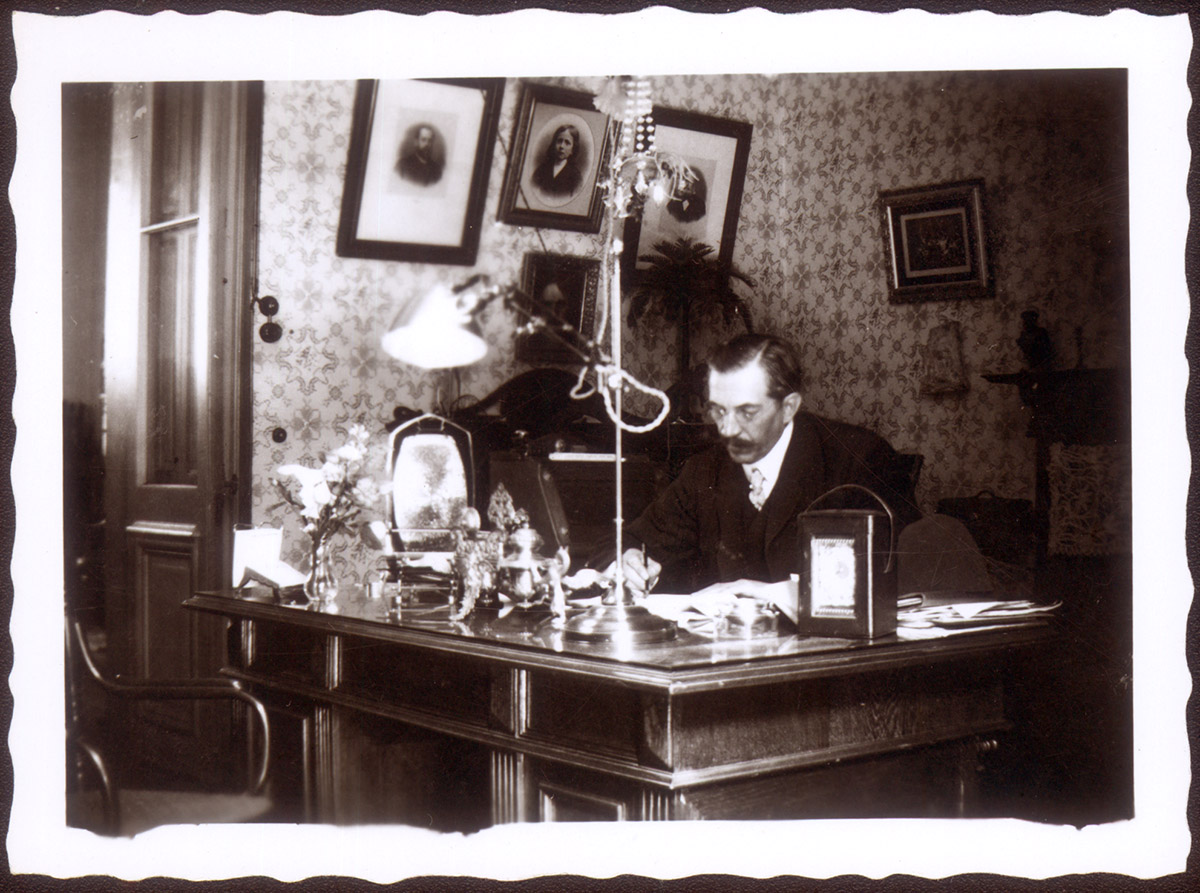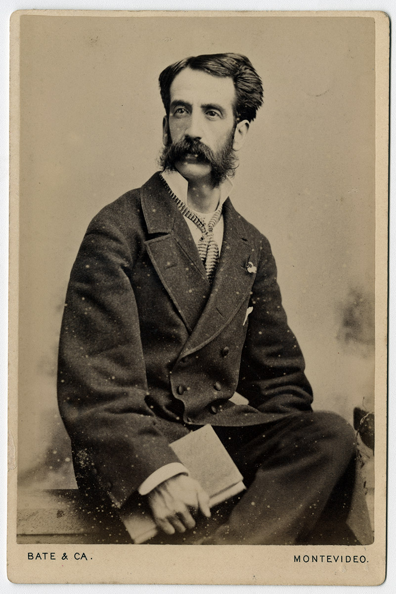 Retrato de un hombre con barba, bigote y abrigo negro. Está sentado y sobre él se apoya un niño con traje negro. A su lado está parado un niño más grande con traje negro y brazos cruzados.