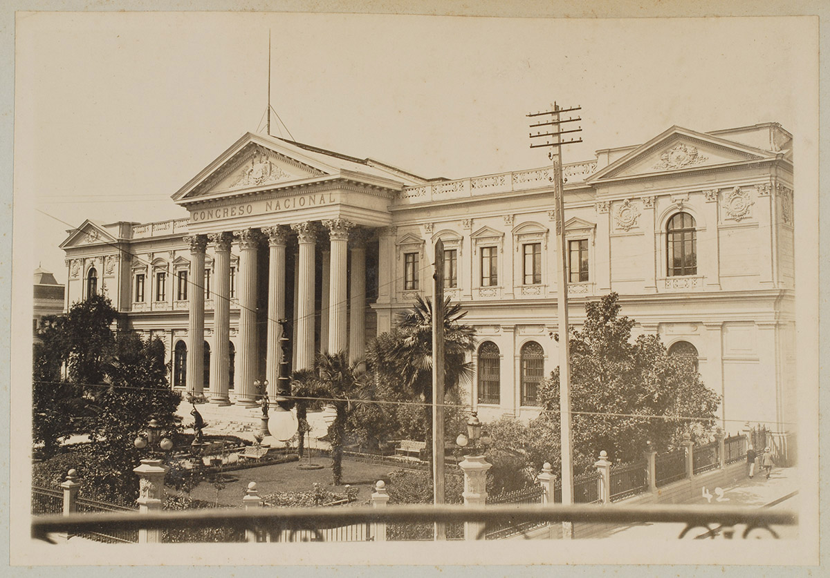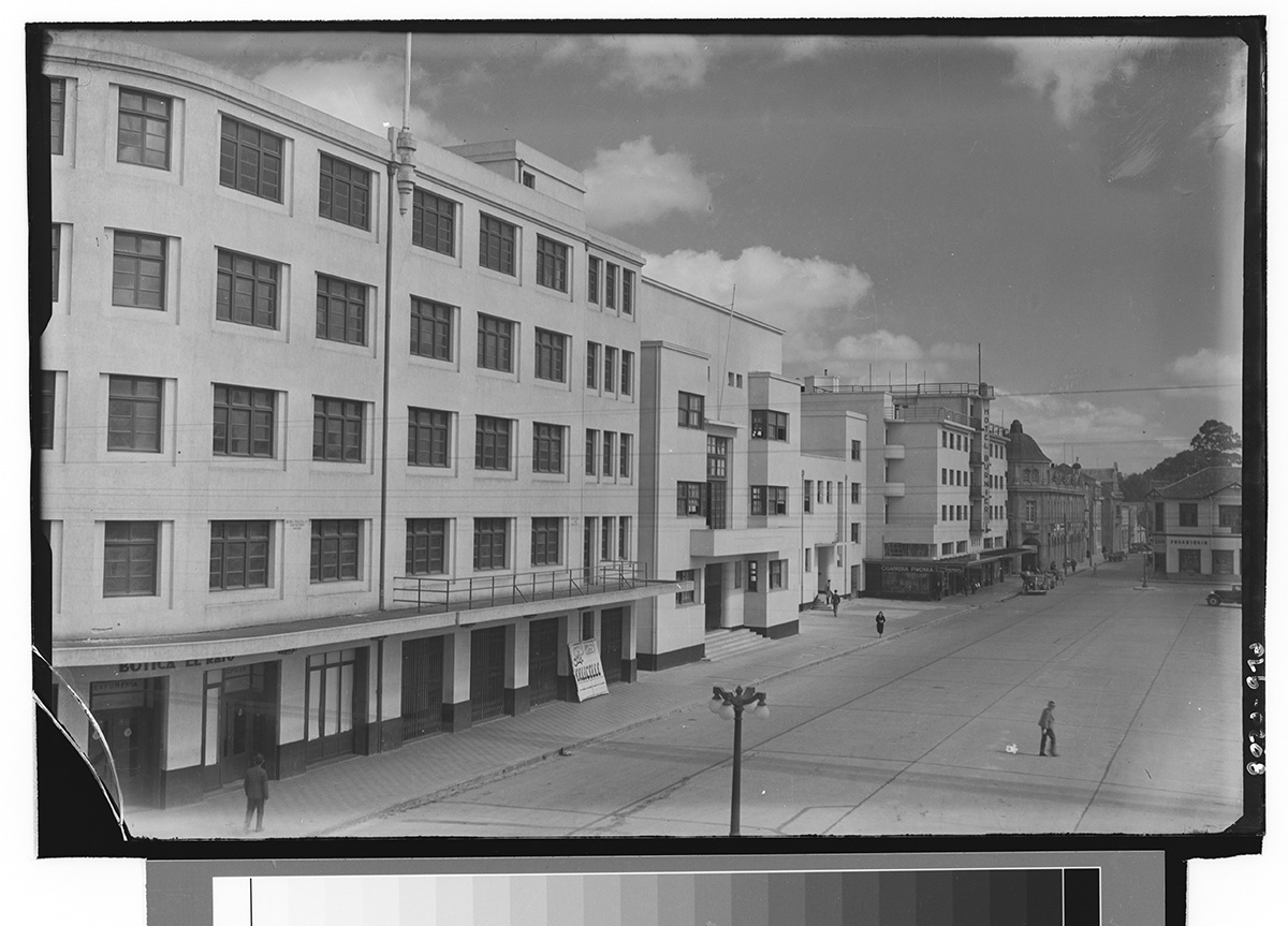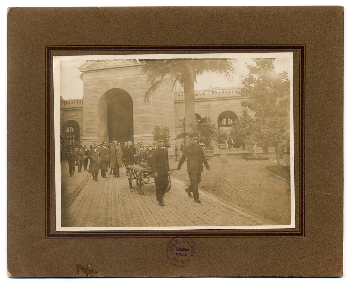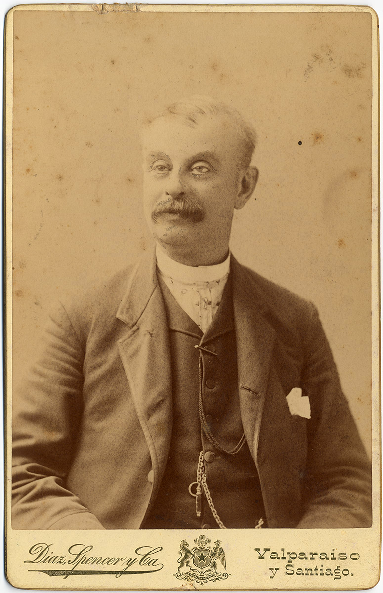 Retrato de un joven hombre con terno negro. Se encuentra parado con un bastón en la mano y su sombrero en la otra.