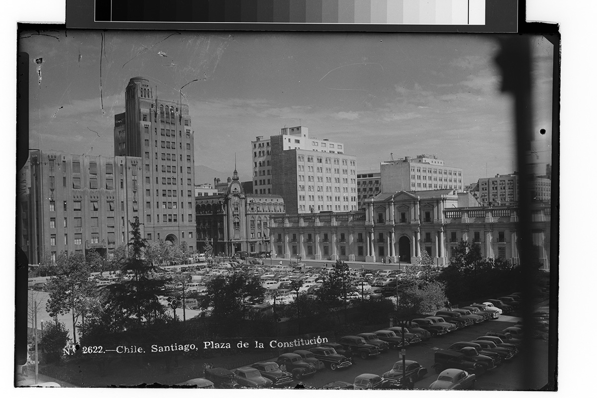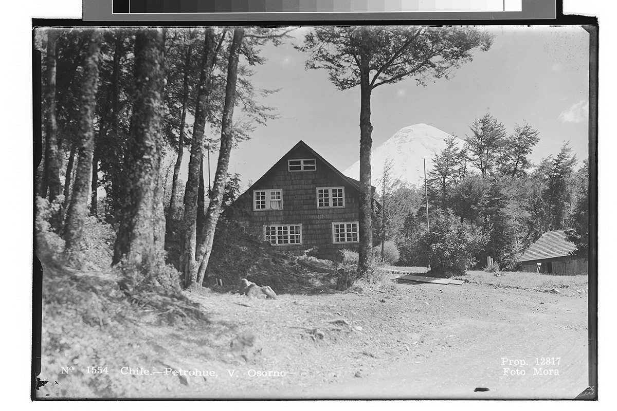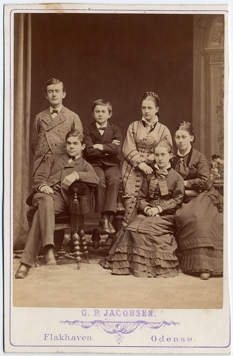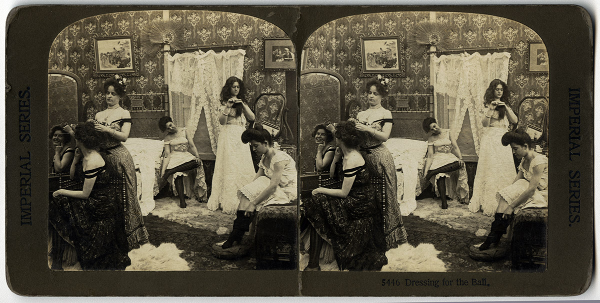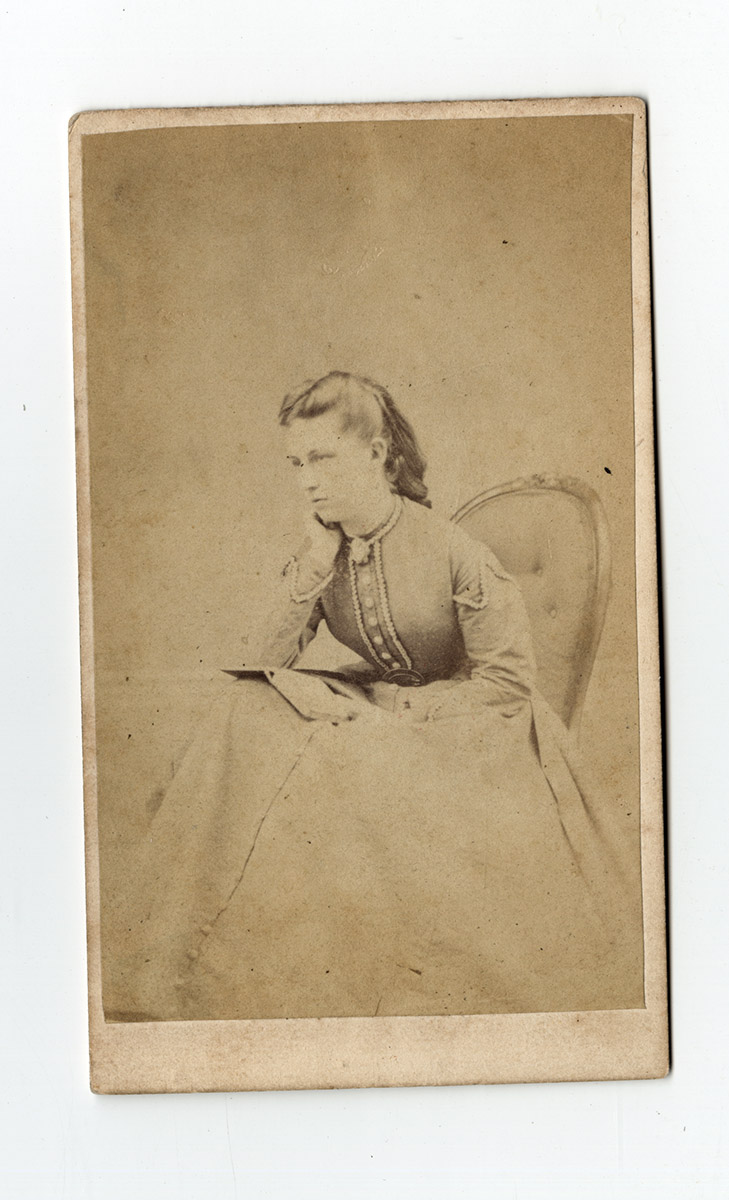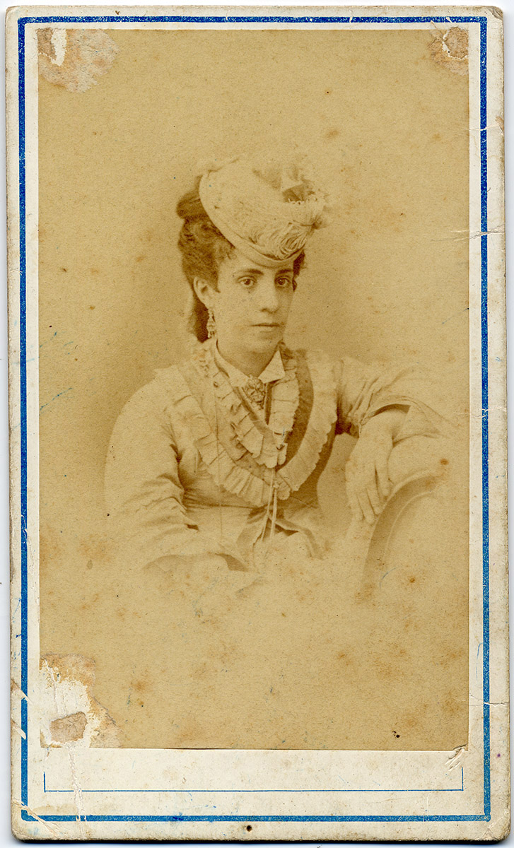 Retrato de forma ovalada de una mujer parada con pelo recogido y vestido negro. A su lado, de pie sobre un taburete y abrazándola, se encuentra una niña con vestido blanco corto.