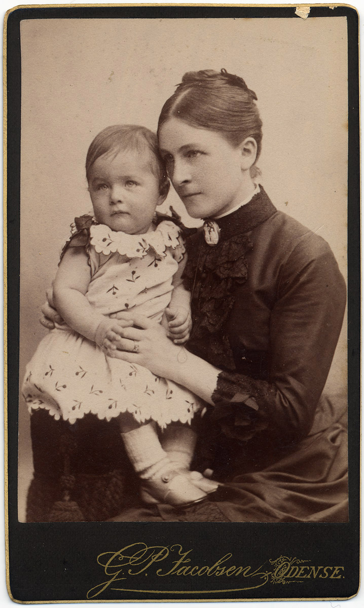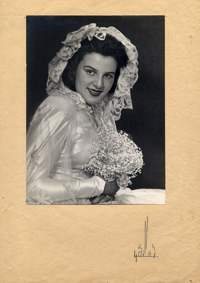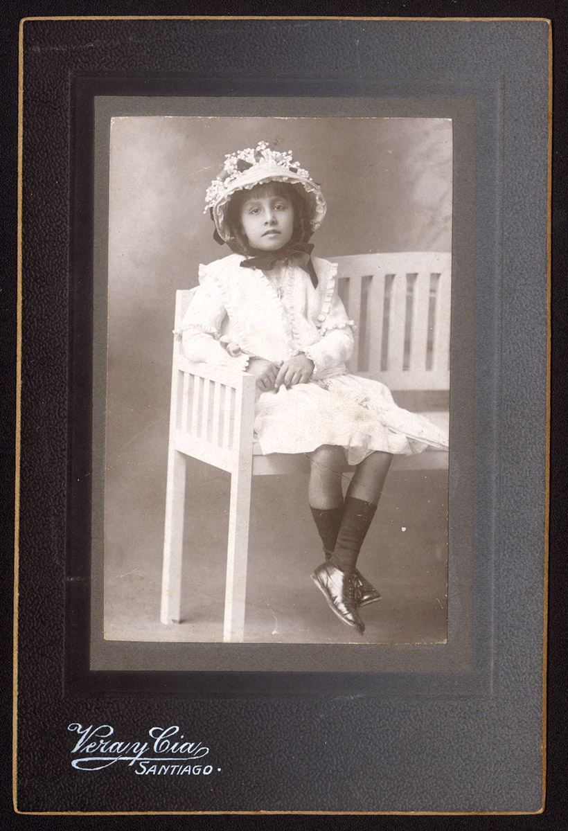 Retrato de busto de una mujer sentada. Lleva el pelo recogido con trenzas y un vestido blanco con adornos.