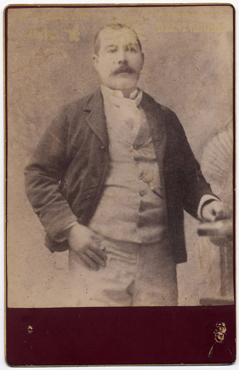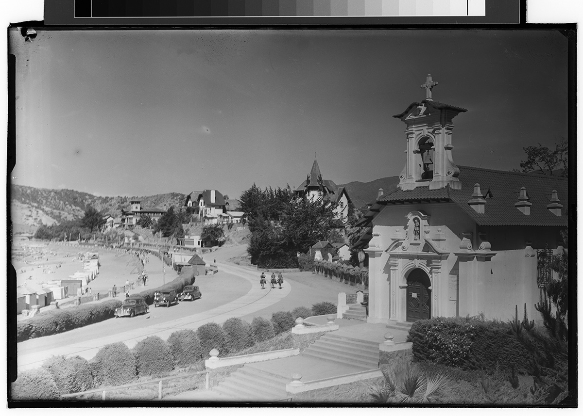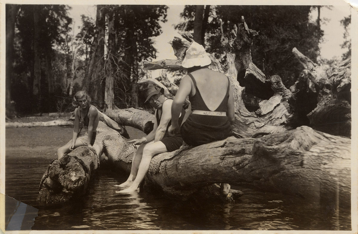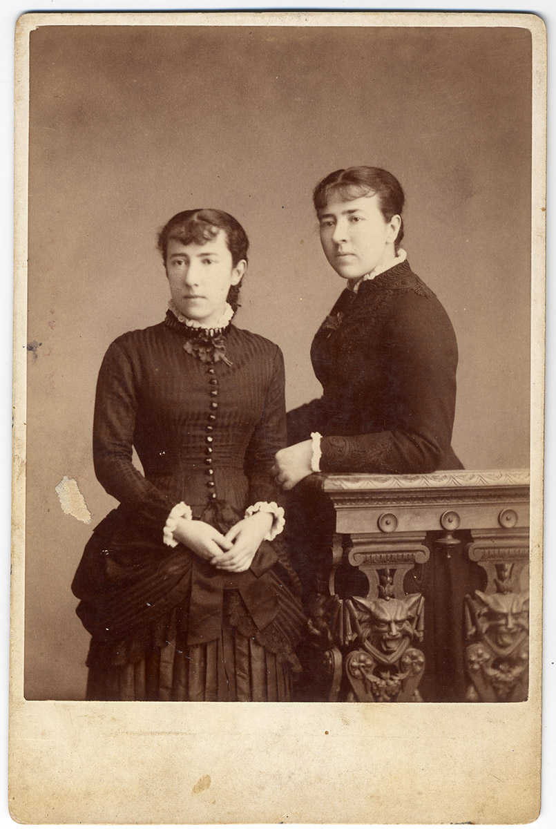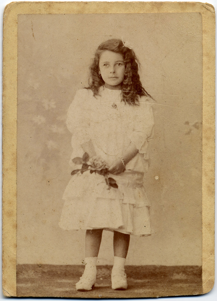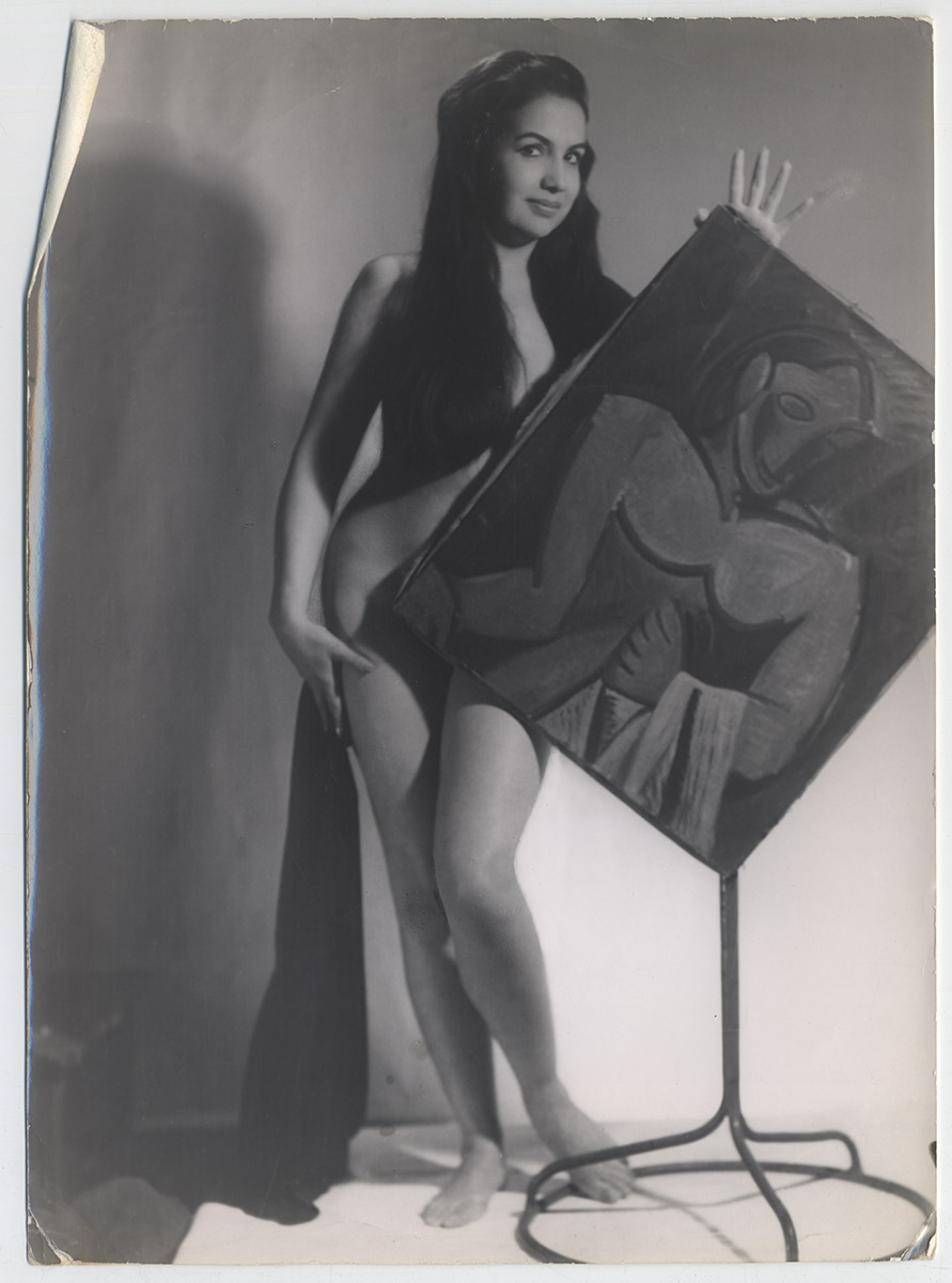 Retrato de busto y de perfil de una mujer con peinado con rulos y vestido. Apoya un brazo sobre una balaustrada y su cabeza sobre un mano.