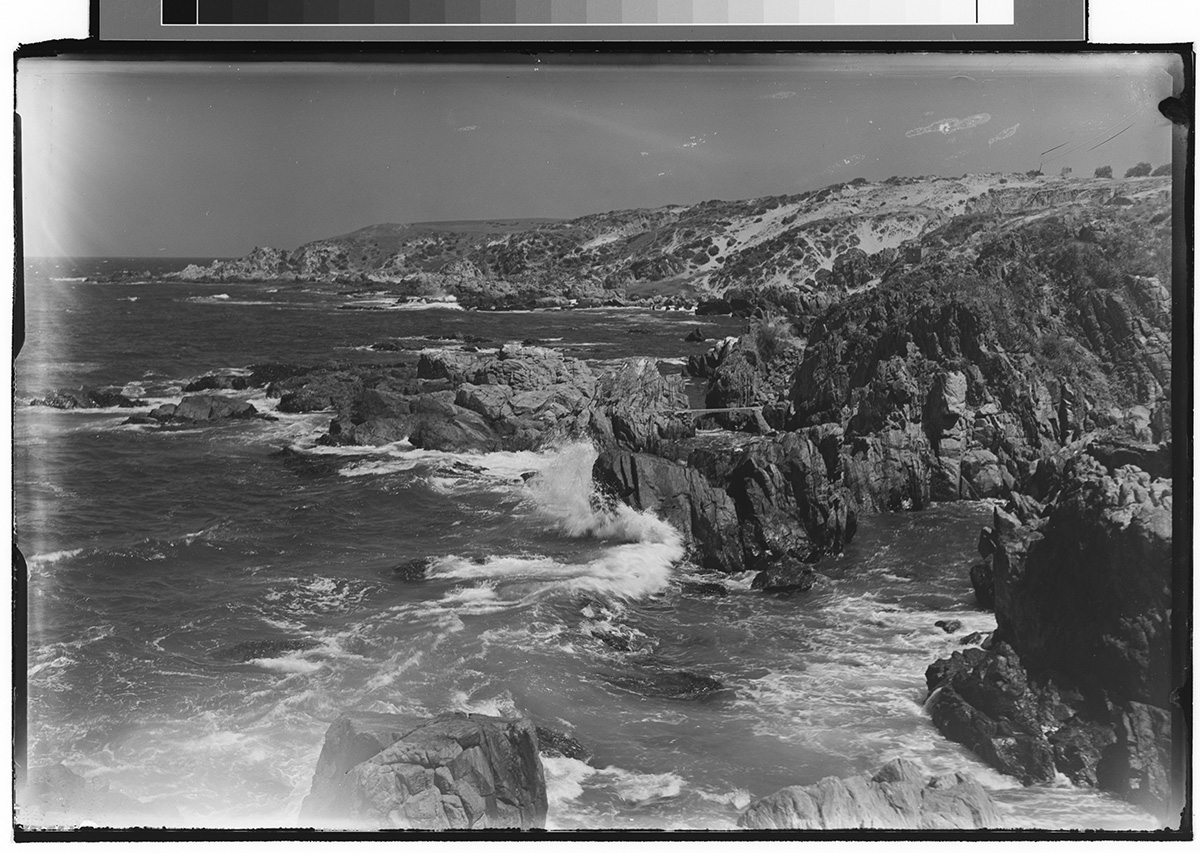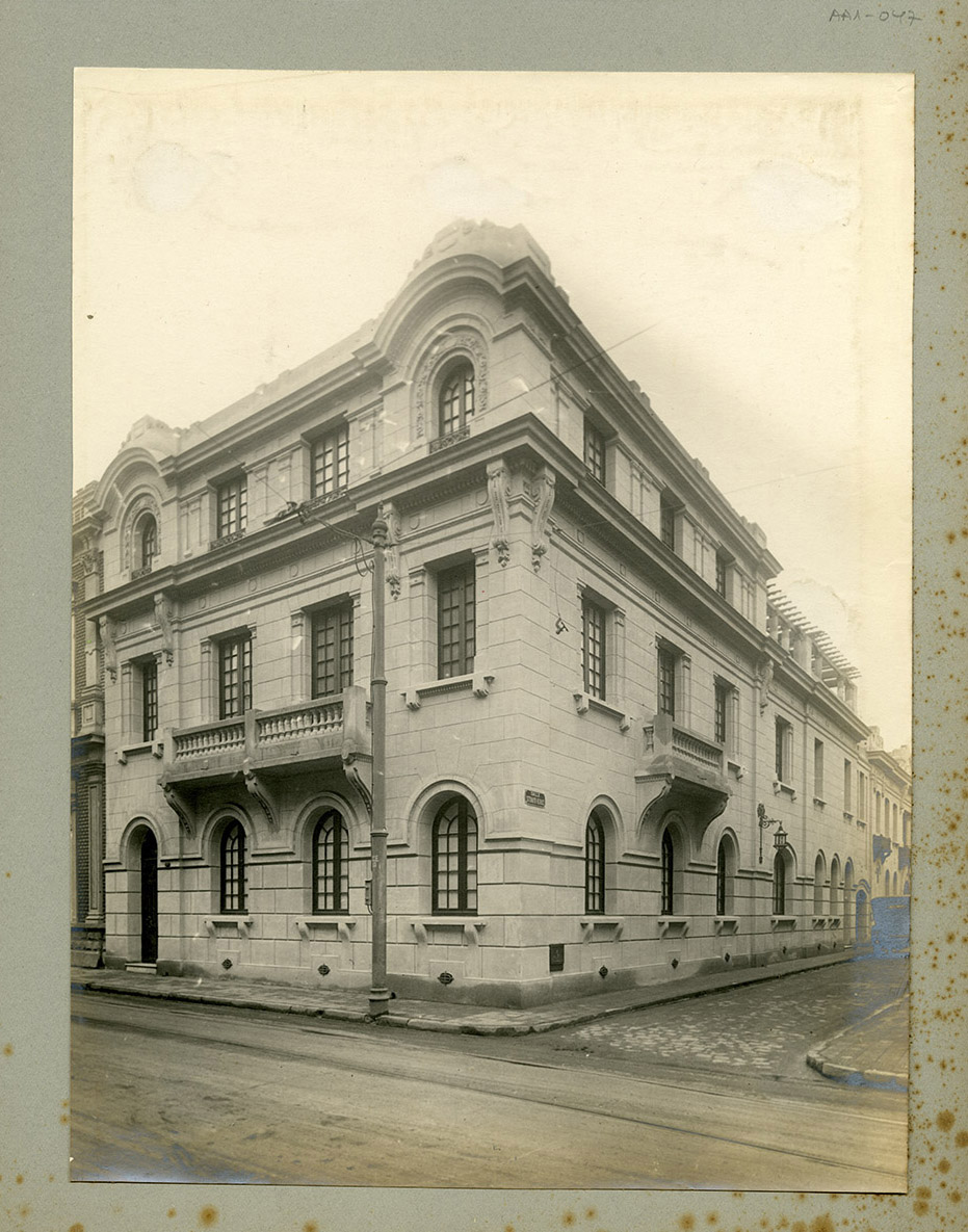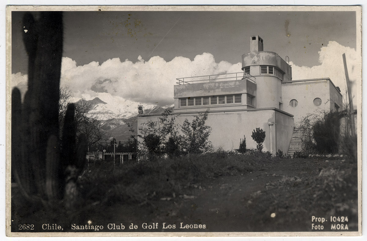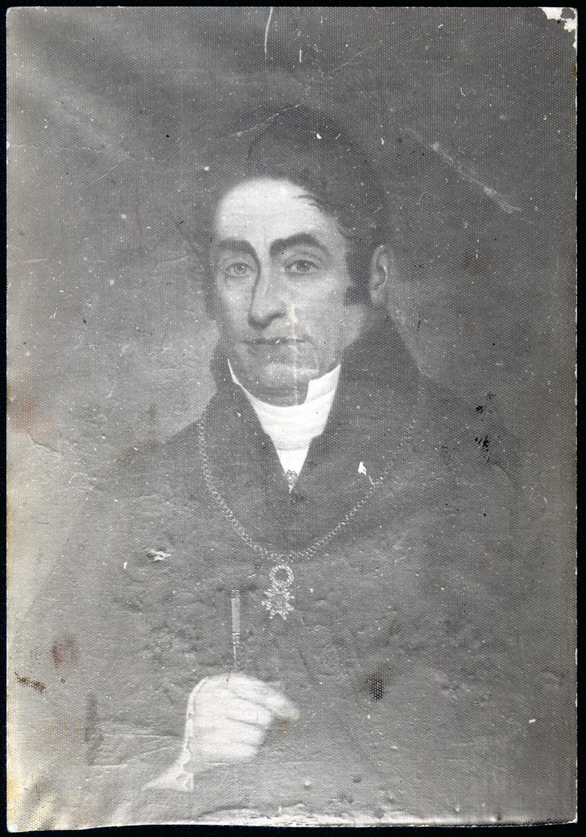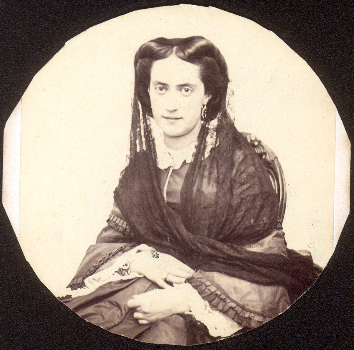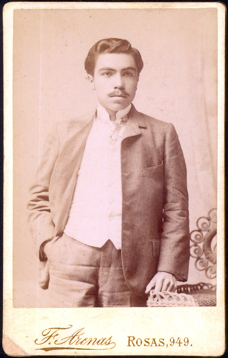 Retrato de pie de una niña con vestido corto escoses. Tiene una mano apoyada sobre una mesa sobre la cual se encuentra un canasto de flores.