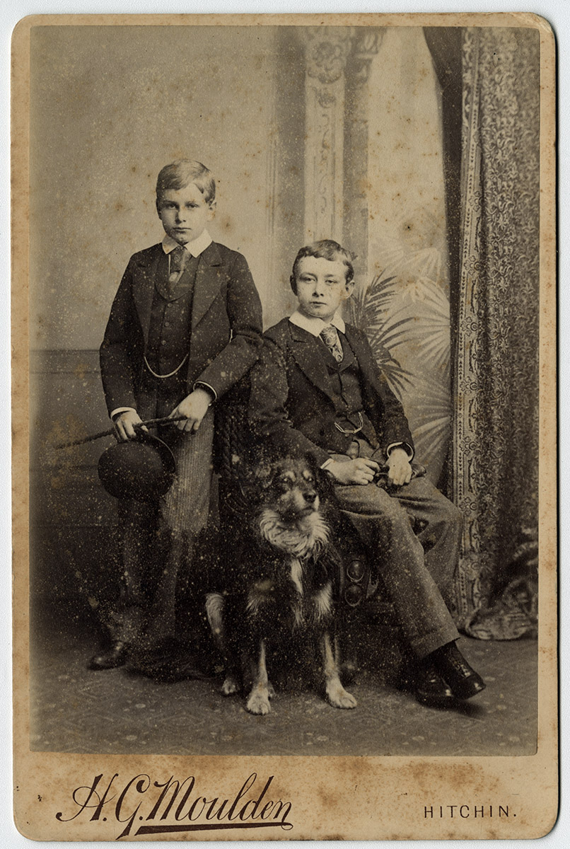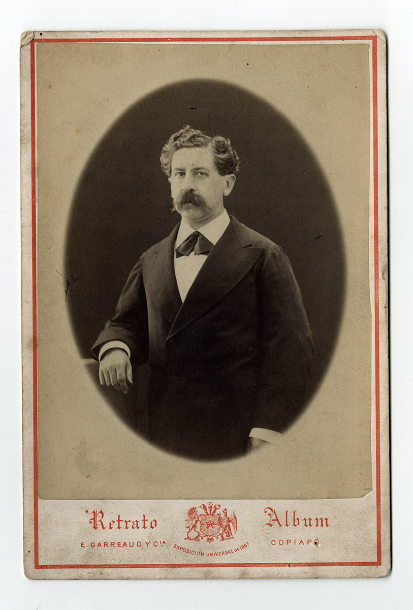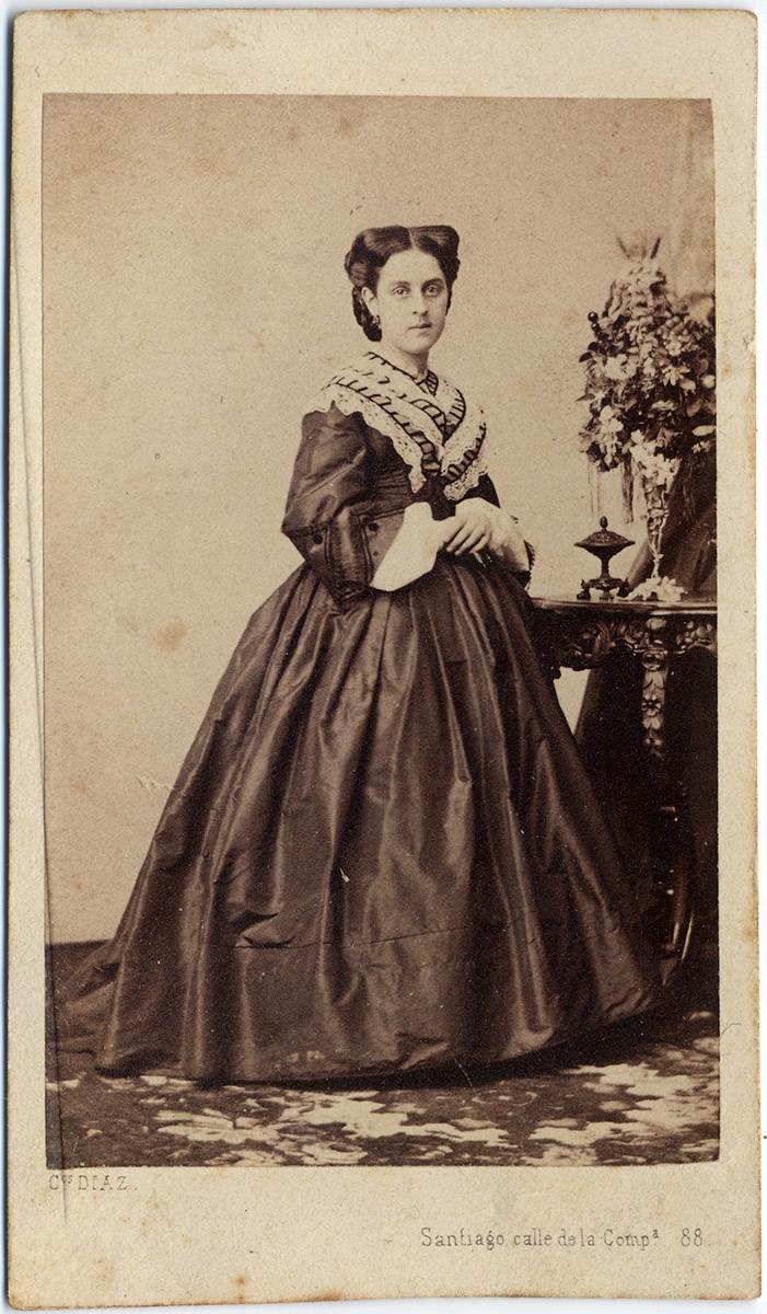 Retrato de una pareja sentada. Ella lleva un vestido con rayas y inglesas. Apoya su mano sobre la rodilla de su compañero. Él lleva bigote, un terno negro y lentes en su mano.