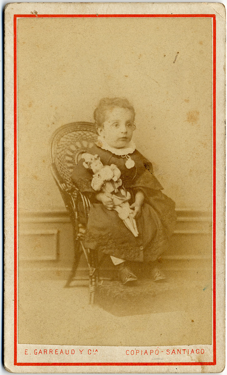 Retrato de dos niñas, de cabello tomado y brazos cruzados sobre el pecho. Están vestidas con trajes de tul, con velo sobre la cabeza. El fondo presenta motivos florales.