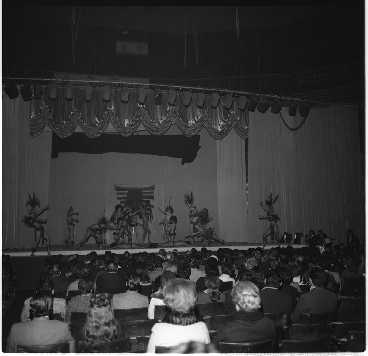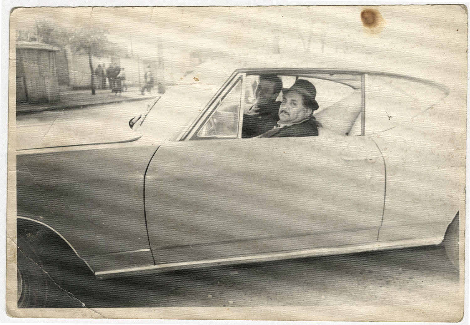 Vista de tres veleros en una bahía y una ciudad. En primer plano se ve un pequeño bote con un hombre.