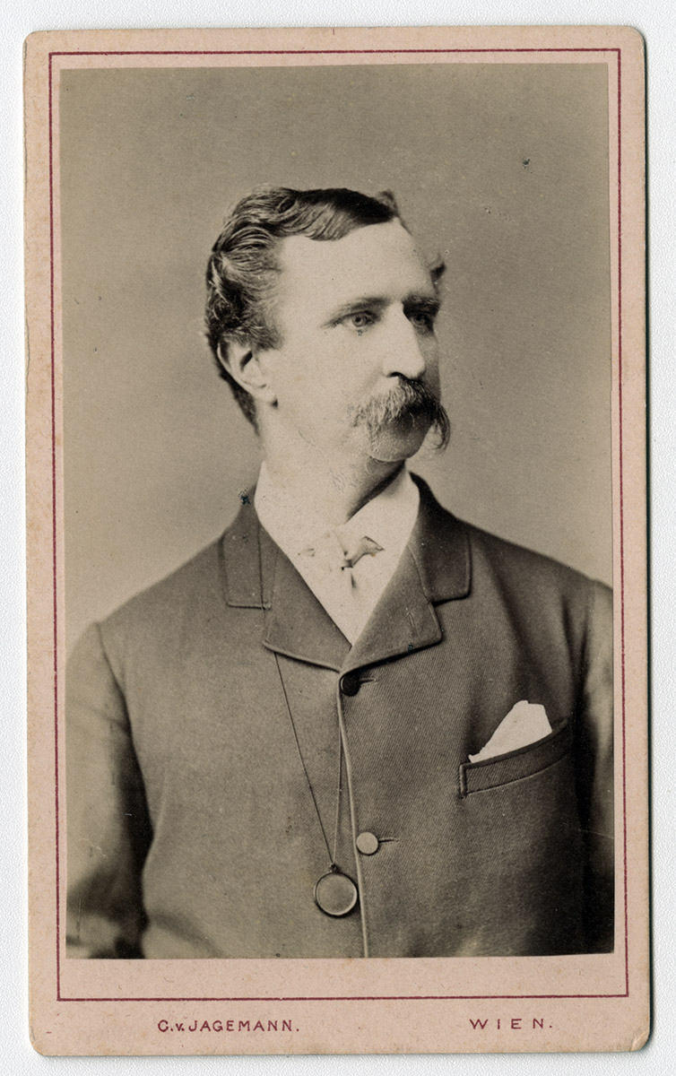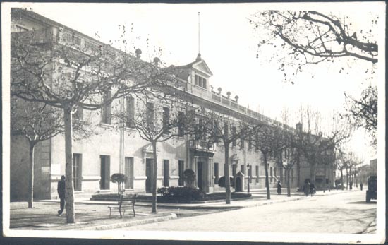 Varias construcciones de dos pisos llegan hasta una esquina, junto a una avenida donde destacan sus faroles en el centro.